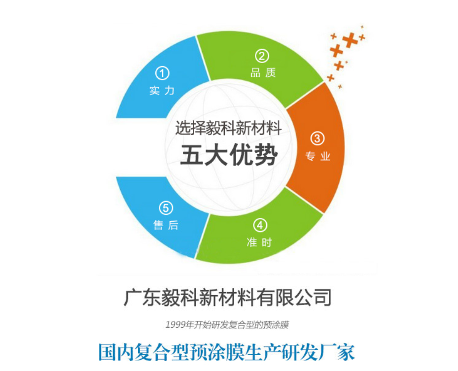 广东毅科新材料有限公司从1999年开始研发复合型的预涂膜,也是国内复合型预涂膜生产研发厂家,十几年来我们不断努力改进产品,优化产品性能,制造多元化复合材料产品。公司主营产品BOPP预涂膜、PET预涂膜、数码印刷预涂膜 ,广告喷绘热裱膜,PET地暖复合材料,产品应用于包装印刷覆膜、办公用品覆膜,广告热裱覆膜、建筑复合材料、光学复合材料等领域 。公司已通过ISO09001:2008质量管理体系认证、绿色印刷环保标志认证、国家高新技术企业认定;EVA型预涂膜行业标准制定单位等荣誉,先进的ERP系统管理,注重知识产权的开发和应用,授权实用新型专利有多项,申请发明专利多项;还拥有一支优秀的研发团队,专业知识和技术经验丰富,能为产品的质量提供强而有力的技术支撑。有良好的企业氛围和浓厚的荣耀网页版登录入口,我司运用5S的管理营造一目了然的工作环境,养成良好的工作习惯,提升员工水平,一起营造一个和谐美好的工作环境,从而达到规范化管理。 感恩,价值,共进,分享是我们的理念,“双赢”是我们的经营方针,我们将进一步完善企业质量管理体制,为客户提供更优质的产品和服务。
